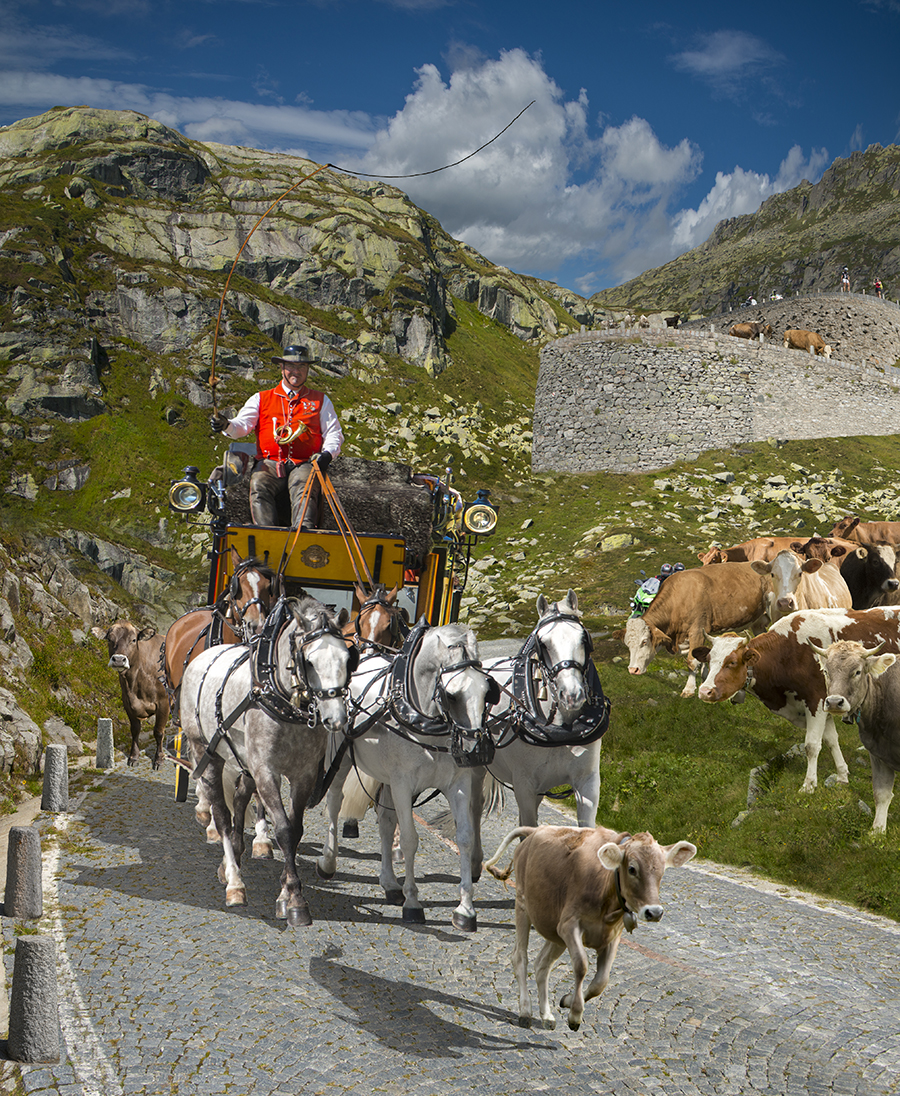Rudolf Koller hatte die fünfspännige Gotthardpost 1873 im Auftrag der Direktion der Schweizerischen Nordostbahn gemalt. Vorangängig hatte er unzählige Skizzen gemacht und die zweispännige Gotthardpost angefertigt. 1884 hatte er ein Replik der fünfspännigen Gotthardpost für die Credit Suisse gemalt. Koller hatte zur Herstellung der endgültigen Version verschiedenste Motive zusammengefügt, so dass eine dynamische Komposition entstand. Dabei hatte er Elemente so verändert und zusammengestellt, wie sie in der Wirklichkeit nicht zu finden sind. Wer die Tremola begeht, findet schon bald den Ort wo der fiktive Zuschauer gestanden haben muss, doch, sieht auf den ersten Blick etwas anders aus. Alles ist da, aber auseinandergezogen, weniger felsig und nicht so dramatisch. Trotzdem, oder erst recht, entspricht der Gesamteindruck den man dort hat, dem was der Künstler mit dem Bild mitteilen wollte. Ich musste, um in die Nähe seines Bildes zu kommen, in meiner Fotomontage ebenfalls über vierzig verschiedene Elemente verwenden, alles etwas moderner (auch das Kopfsteinpflaster gehört dazu) und weniger dramatisch. Trotzdem bleibt die Tremola, besonders mit der Postkutsche befahren, ein eindrückliches Erlebnis.